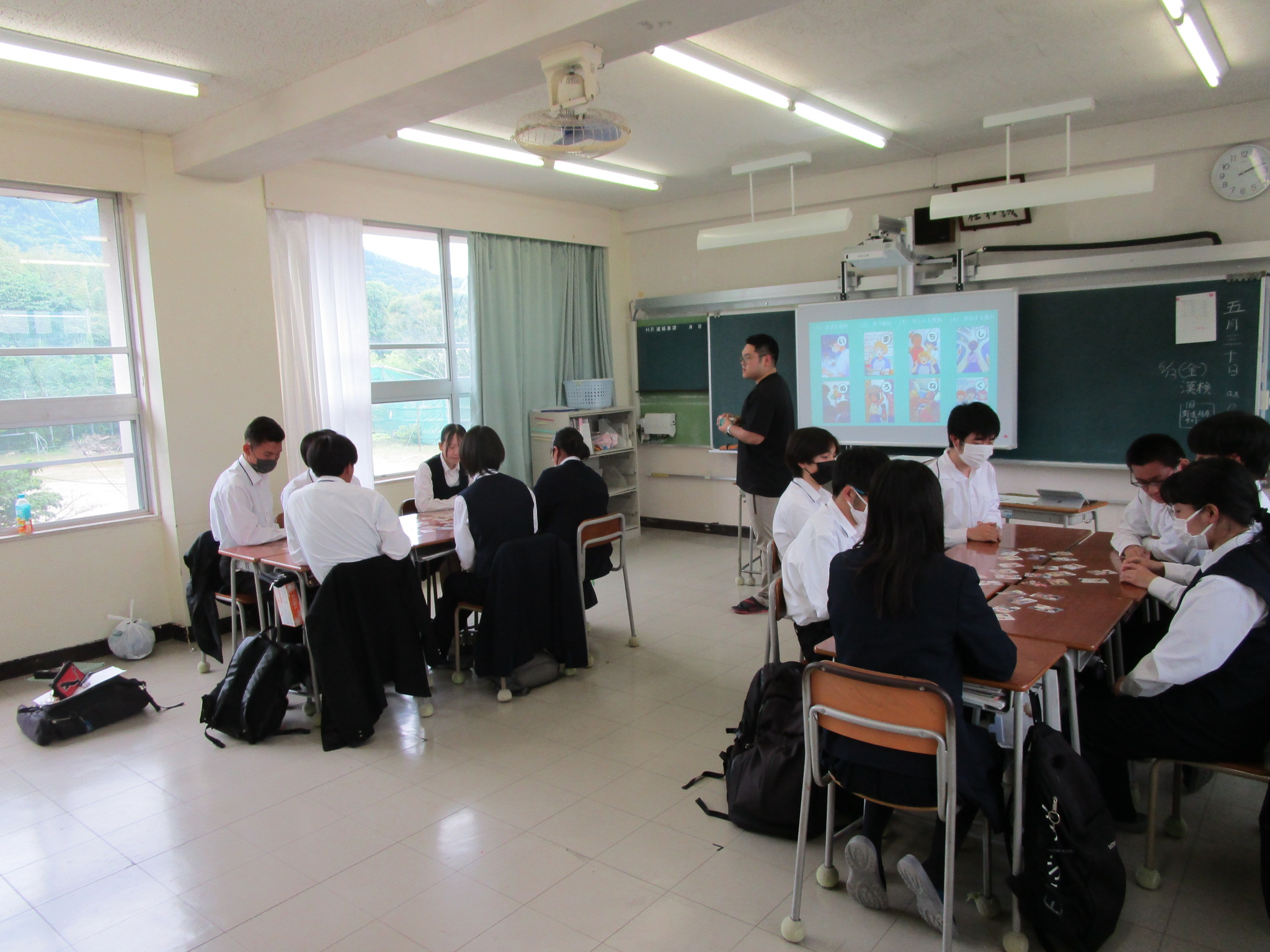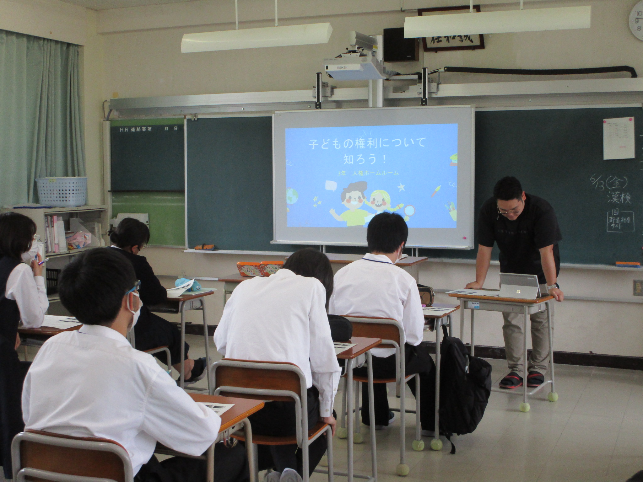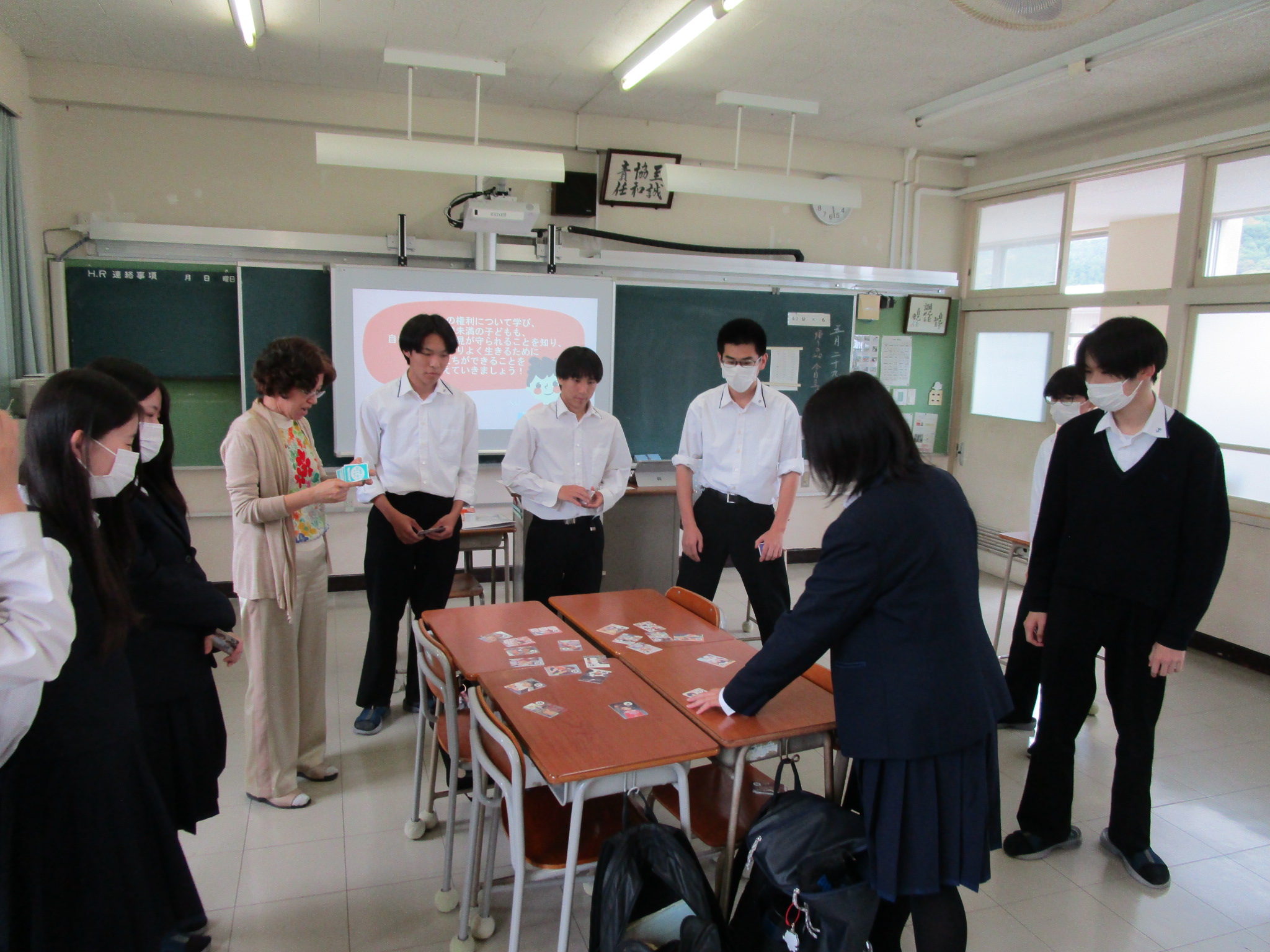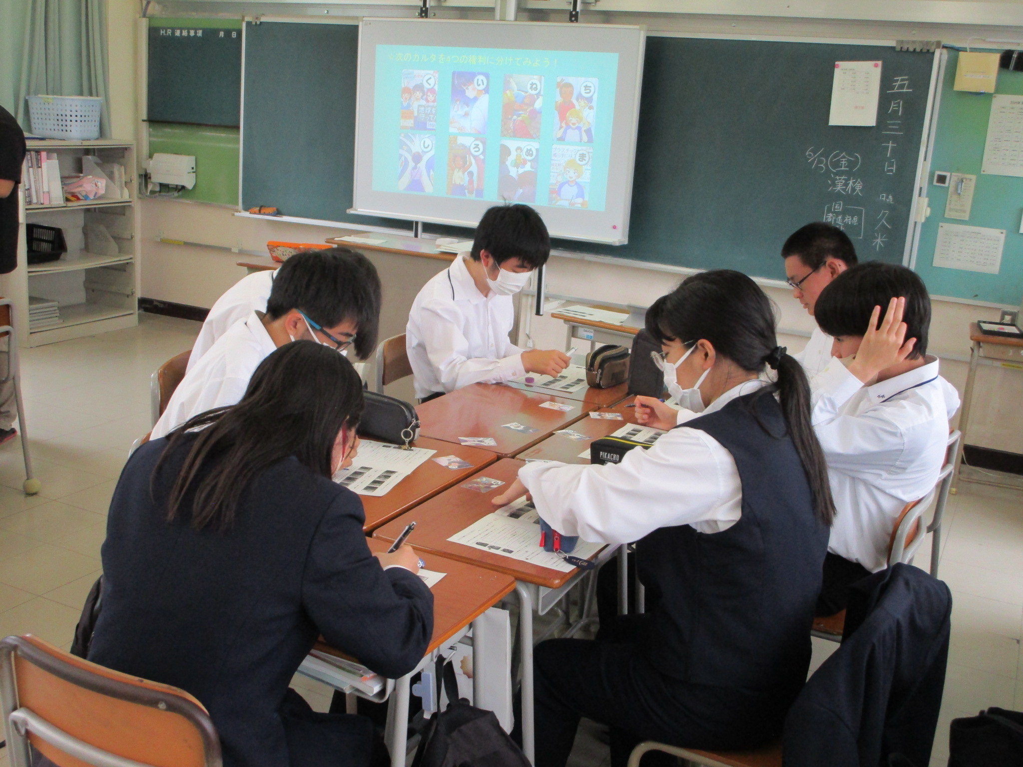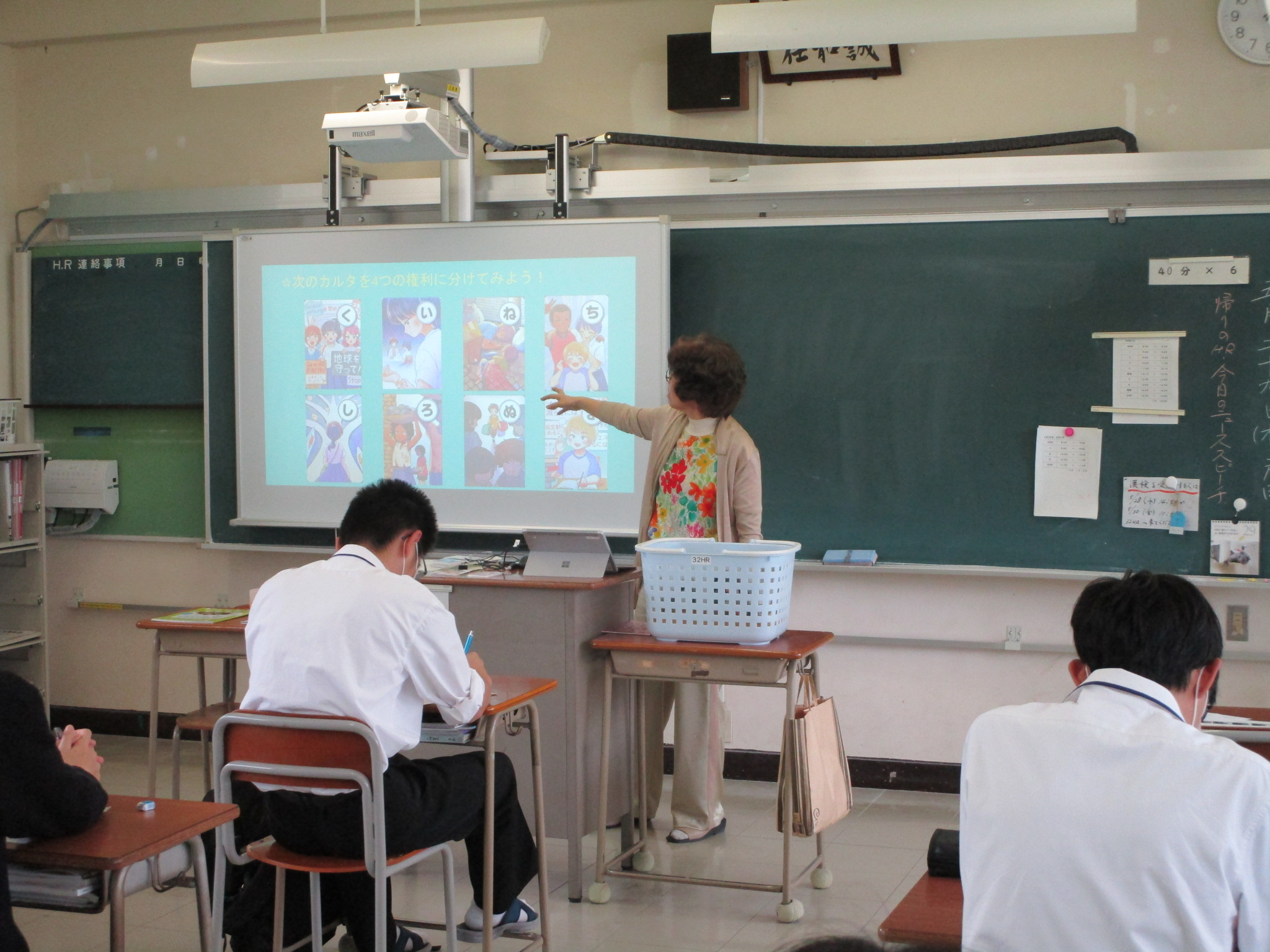 子どもの権利について学びました。カルタを教材に使用し、人権問題に関わる内容等について情報を共有しました。授業の最後に2つの事例についてどう対応するかまとめ、生徒は個々の考えをまとめていました。