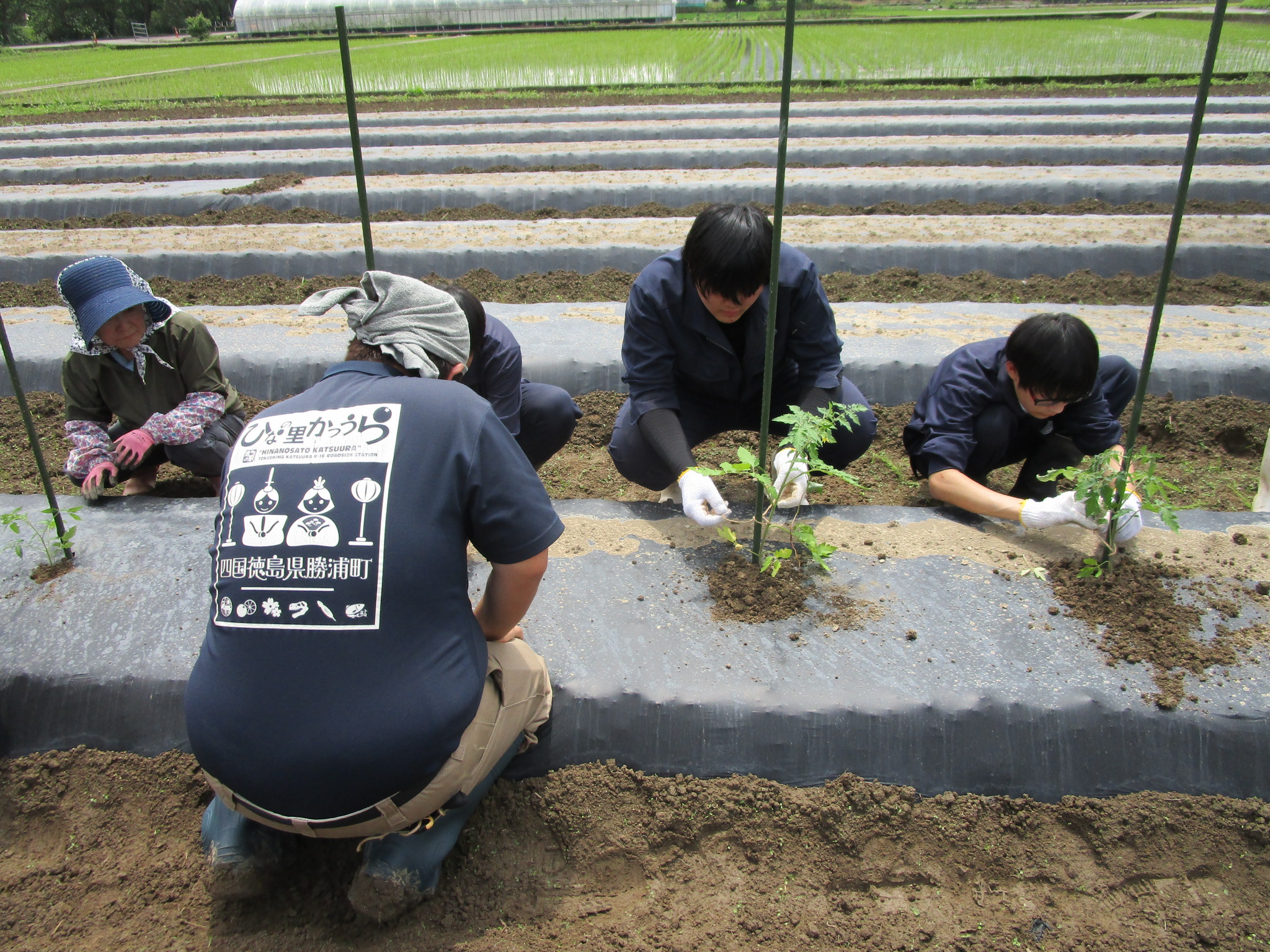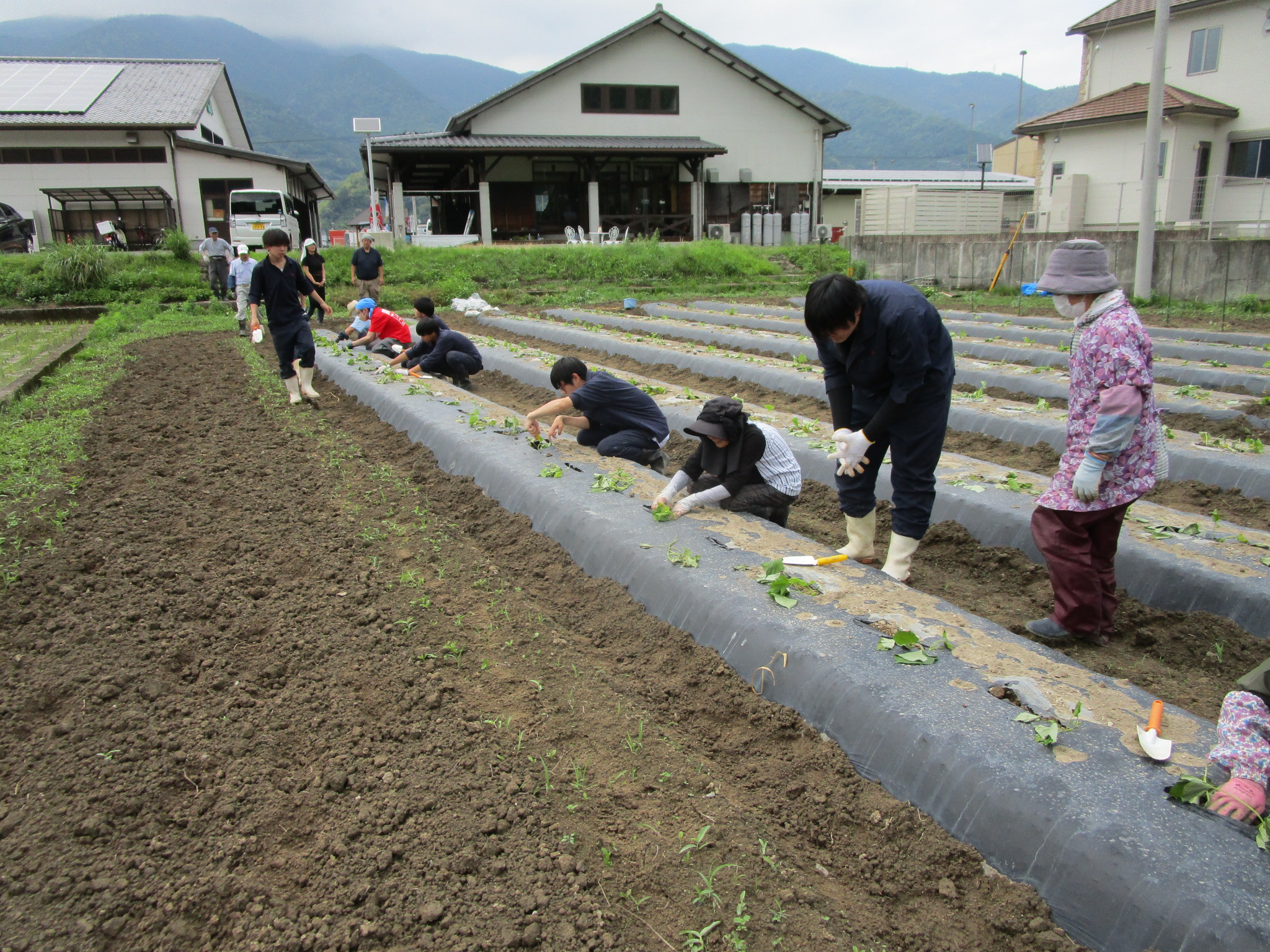 6月13日(金)に勝浦校野菜専攻生徒7名が道の駅ひなの里の観光農園にイベント用のサツマイモを植え付けました。この日は阿波勝浦井戸端塾のみなさんと交流し、約300本の苗を植え付けました。加工用トマトの苗も植え、勝浦校と道の駅が共同開発中の野菜カレーの材料として利用します。